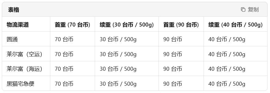 店配 :买家到便利店取货。普货首重 70 新台币,续重 30 新台币 / 500g;特货首重 90 新台币,续重 40 新台币 / 500g。但前台默认显示运费有所不同,普货前台显示 55 新台币,特货前台显示 60 新台币,其余运费差额由卖家承担。