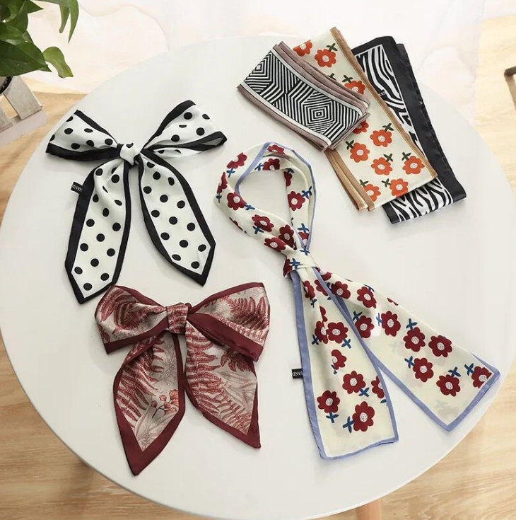 韩式多功能真丝缎面小方巾一物多用(发带、颈巾、包饰等),精准契合现代消费者追求“少物多用”和“轻出行”的简约生活方式。