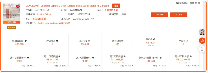 知虾数据显示,巴西站点一款裸色系唇线笔 + 哑光/亮面唇蜜套装在 7 日内售出 74,141 件,成为兼顾实用与精致的代表性爆款。