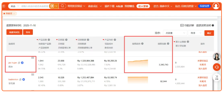 知虾数据显示,在印度尼西亚站点,“雨衣”搜索指数达到了惊人的 3,343,743;而“雨伞”搜索指数也已经达到了 1,415,140。