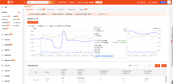360° 竞品追踪:可监控对手广告关键词、上新频率甚至大促预算调整,有卖家借此在双 11 反超竞品 20 单销量;